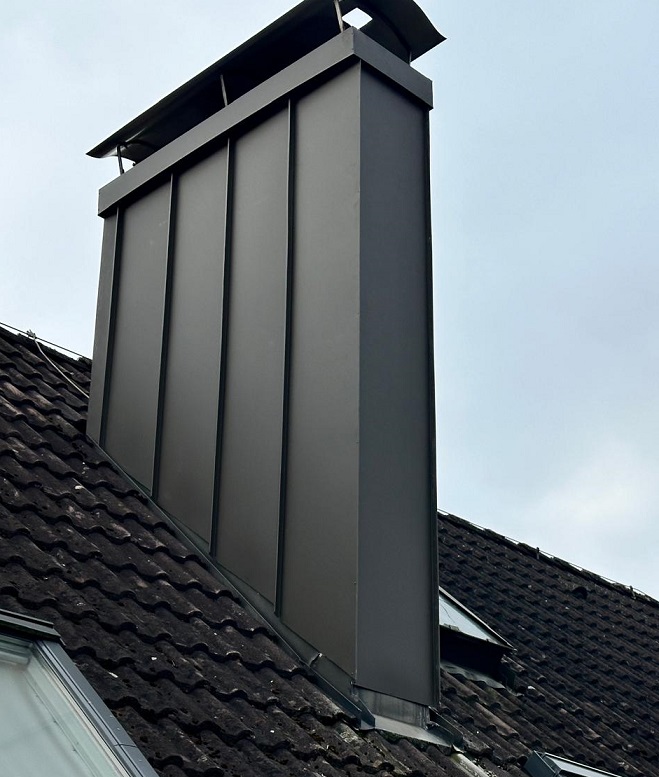 Dieser große Kamin wurde von unseren Mitarbeitern mit Aluminium neu verkleidet. Die Verkleidung wurde in mehreren Teilen angefertigt und auf der Baustelle montiert. Auch die Kaminkranzverkleidung wurde erneuert.