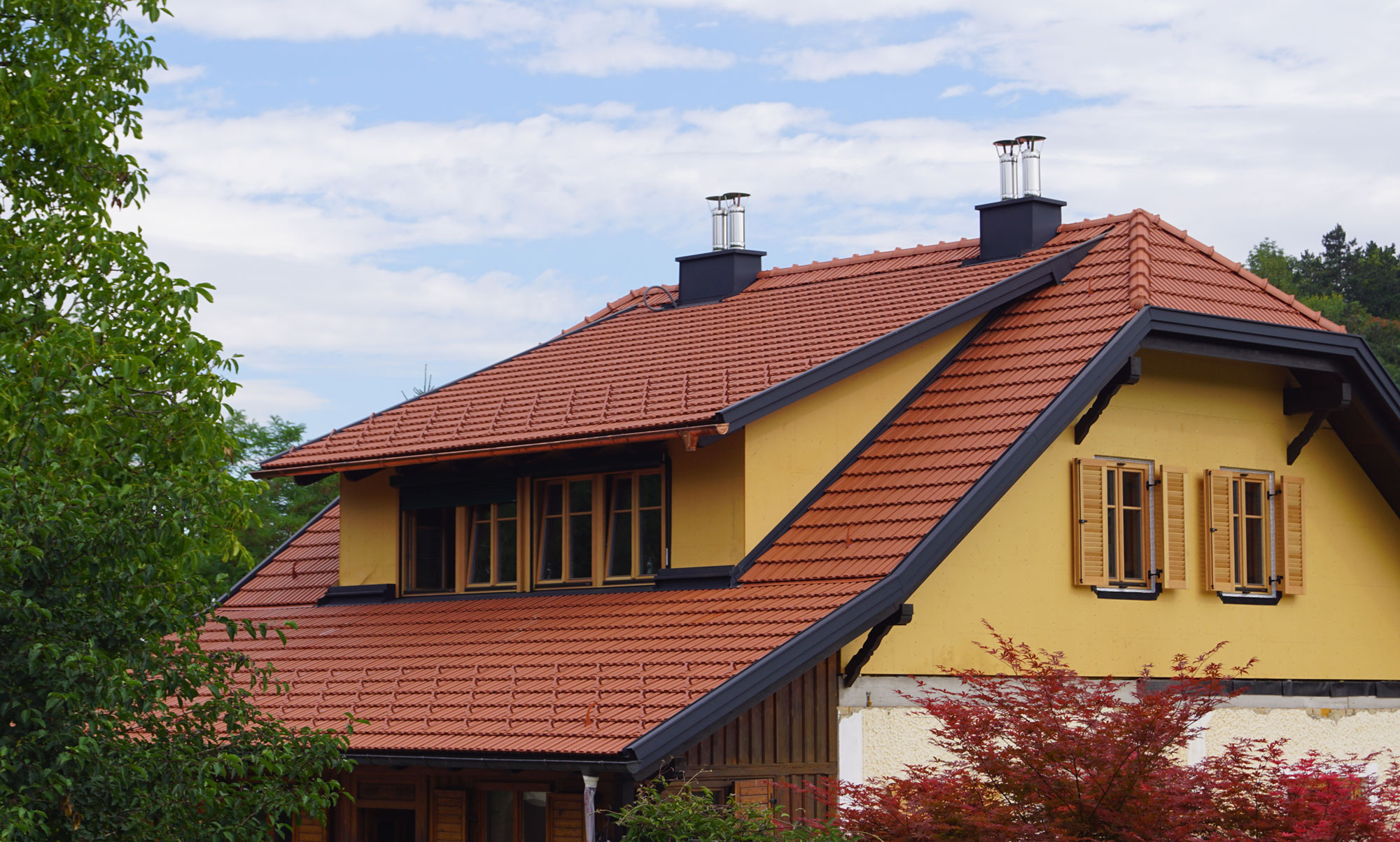 Dach gedeckt mit Prefa-Dachplatten in anthrazit, drei Kamine verkleidet mit Aluminiumblech anthrazit, ein Entlüftungsrohr